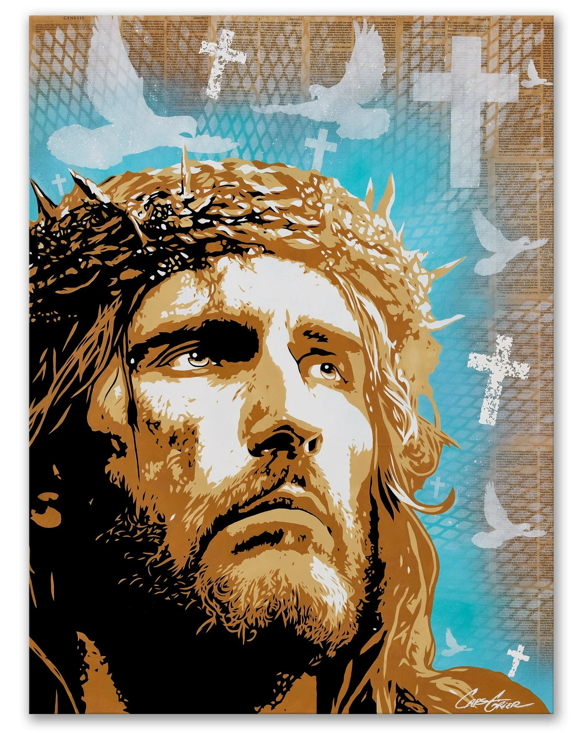 JESUS CHRIST - 30” x 40” x 1 1/12” - Antiqued Bible Pages (Genesis scripture background) and Aerosol on Gallery Wrapped Canvas.