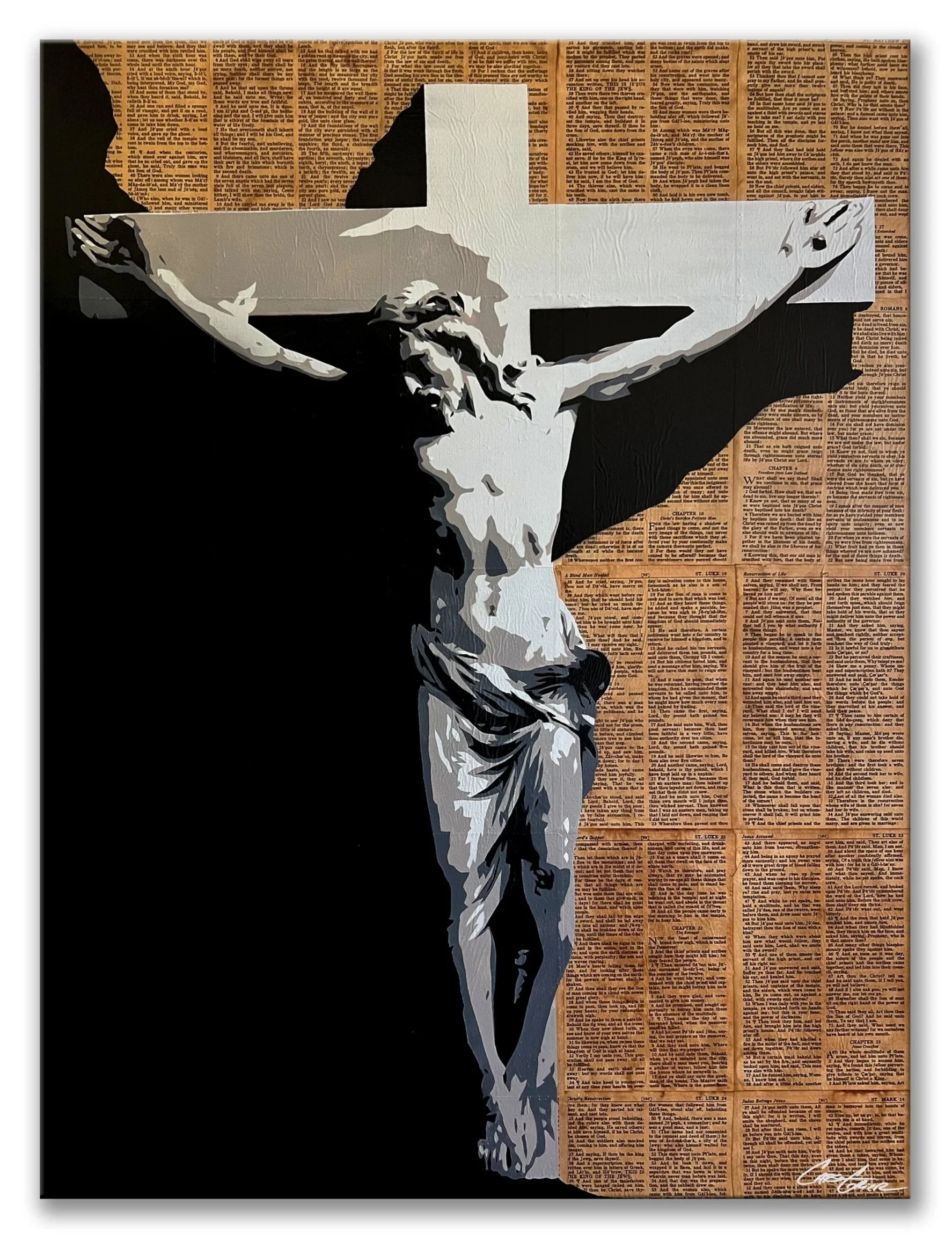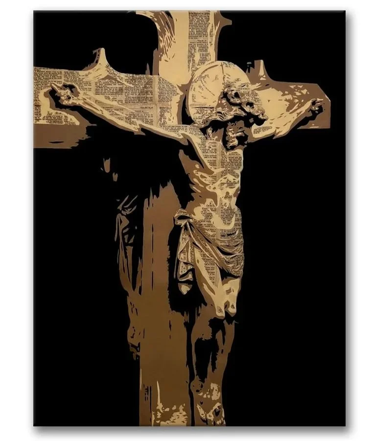 JESUS CRUCIFIXION #1 - 30” x 40” x 1 1/12” - Antiqued Bible Pages (crucifixion scriptures) and Aerosol on Gallery Wrapped Canvas.