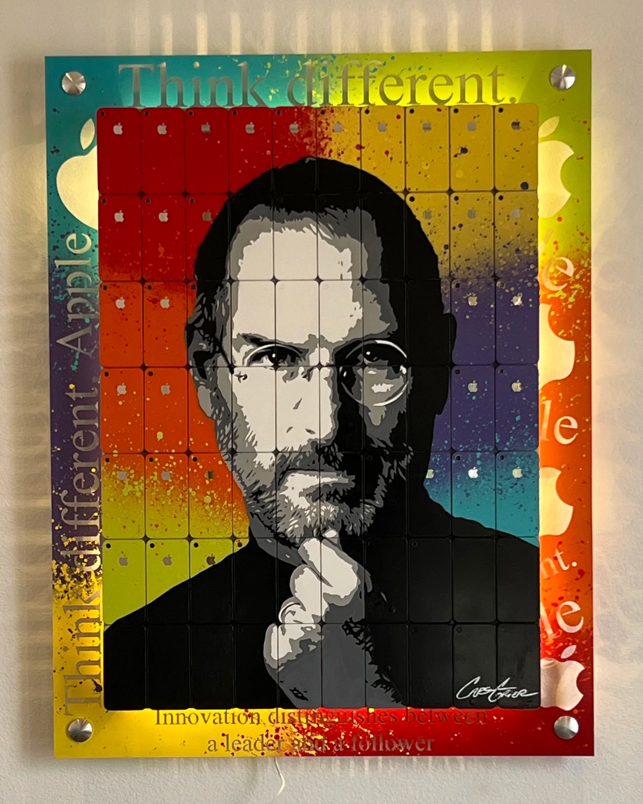 STEVE JOBS CREATED USING (70) iPHONE 4S PHONES, LAZER CUT METAIL, MULTI LAYERED, BACK LIT WITH REMOTE LED’s